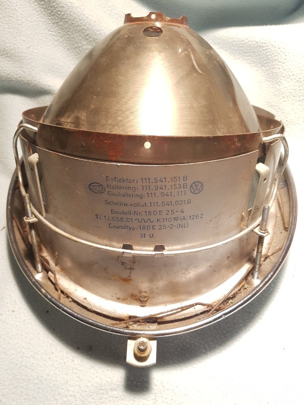 Hans hat recht, das ist ein früher Hella Reflektor (zu erkennen an den beiden Aluminium Lager-Achsen die hier gegenüber auf 3 + 9Uhr sind). Die seitliche Verstellung erfolgt hier noch seitlich mit einem Hebel.