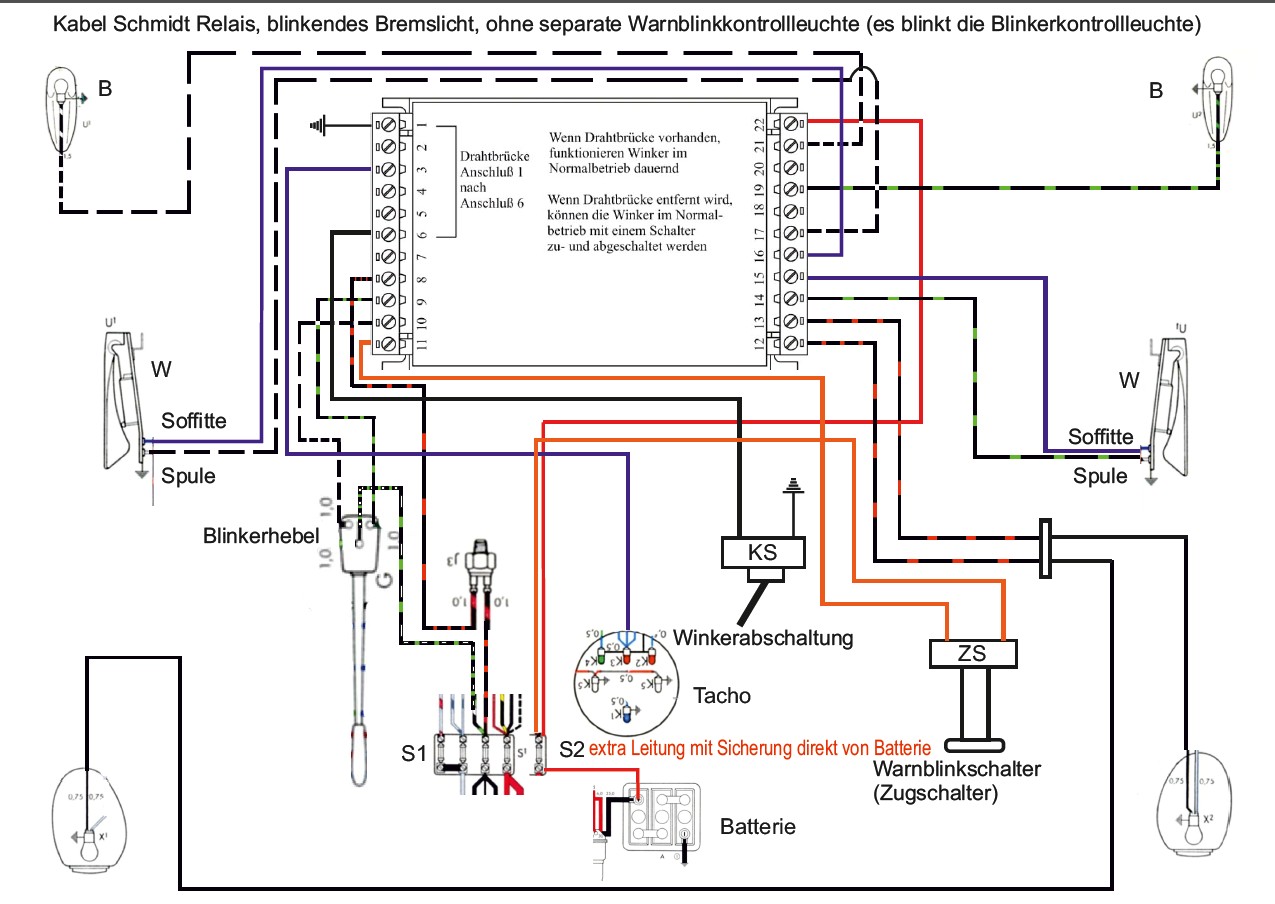 das Relais von Kabel Schmidt ist auch meine Nummer 1 , auch wenn es laufend teurer wurde. Der Warnblinker ist neben dem Blink-Bremsen integriert, der Winker kann ein und aus geschaltet werden und für mich wichtig ist die Anhängerschaltung. Achtung: Beim Arbeiten an den Blinkern etc. immer die Batterie abklemmen selbst wenn man nur ein Birnchen wechseln will. Das Relais ist nicht gegen Kurzschluss gesichert. Ich lasse den Winker nur leuchten wie im Original und nicht blinken. Montiert habe ich es unter dem Radio. Ich habe hier aber auch eine schwarze Kunststoffbox die aussieht wie ein großer Sicherungskasten.