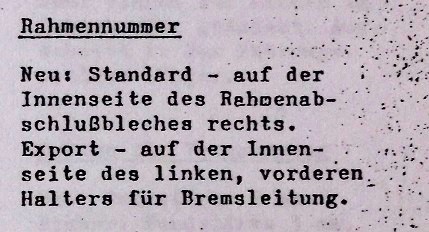 Das Wort Fahrgestellnummer ist vielleicht etwas missverständlich, da hier der Rahmen auch das Fahrgestell ist (daher spricht man ja heute auch nur noch von der FIN Fahrzeugidentifizierungsnummer anstatt Fahrgestellnummer). Die Rahmennummer ist irgendwann entfallen (Schätze schon 1952 mit Einführung des Zwitter, müsste man jetzt aber noch mal genauer ermitteln).