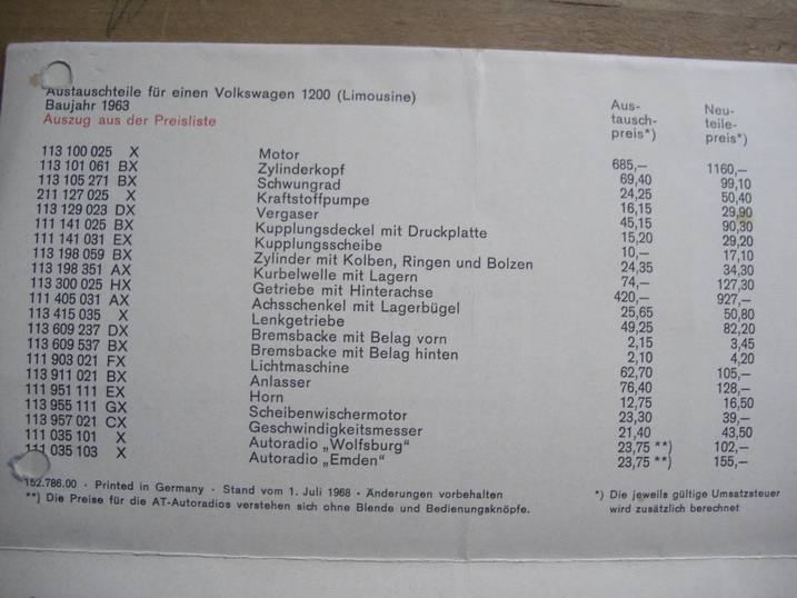 Was ich aber habe sind zwei VW Prospekt über original VW Austauschteile von 1963 ( 1200 ) + 1966 (1300 ).