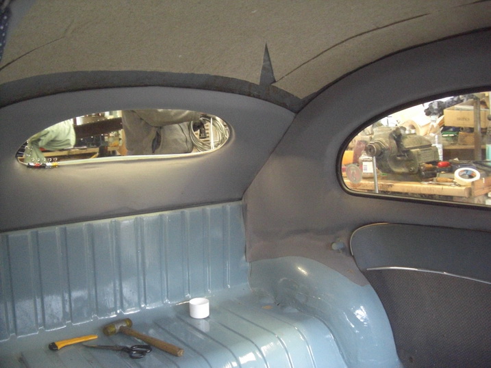 Das Auspolstern um die Fenster herum , die Ausschnitte für Seitenfenster und Heckfenster und den Himmelstoff mit den Polsterstücken von der B - Säule zu vernähen.