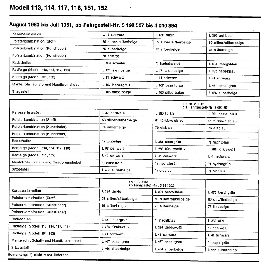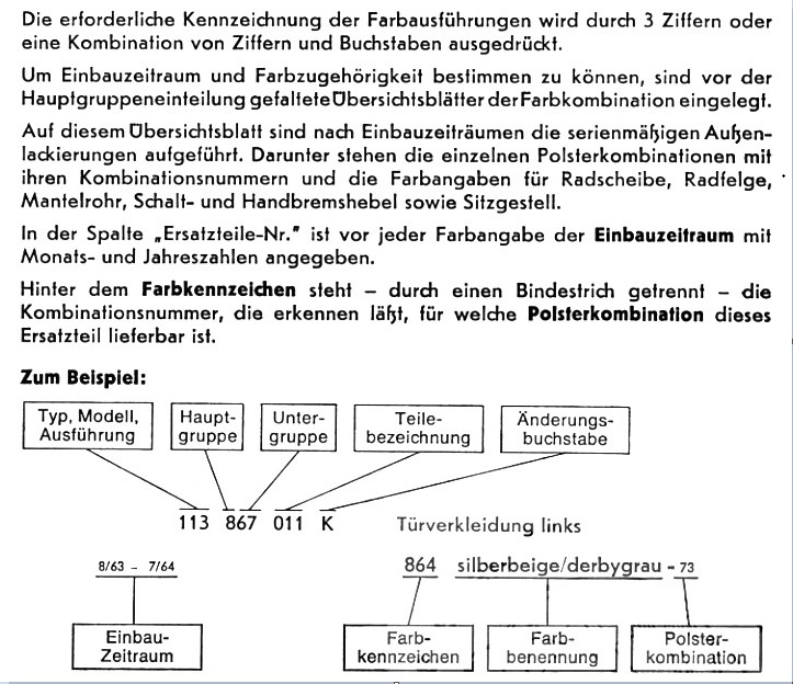 einzig die lenkradfarben werden in den ersatzteillisten aufgeführt. wenn man davon ausgehen mag - was aufnahmenn von vw und aus der zeit nahelegen - , dass in einem bestimmten zeitraum (welchem?oktober 1952-1960? ab 8-1960 werden die listen etwas genauer zu lenkrad und blinkergehäuse...) sämtliche lackierten accessoires im innenraum - lenkrad,mantelrohr,winkerschaltergehäuse,schalthebel,handbremshebel,sitzgestellrahmen - dieselbe farbe trugen, kann die lenkradfarbe darüber einen aufschluss geben. aber welche farbe mit welcher aussenlackierungs-/stoff-/kunstlederkombination kombiniert war und ob man als käufer darauf einfluss nehmen konnte? vollkommen unklar.