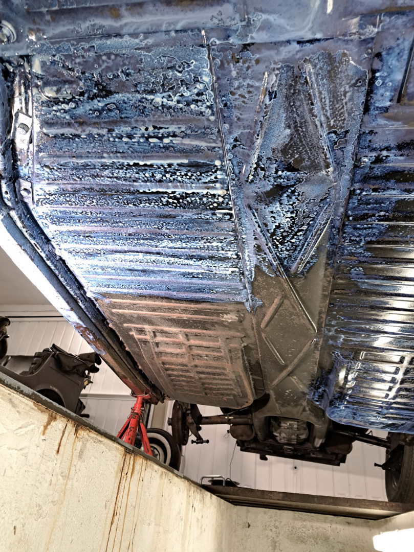 Inzwischen ist die Unterboden-/Karosserie-Konservierung fortgeschritten, ich hab an den beiden hinteren Kotflügeln und am Bodenblech angefangen: