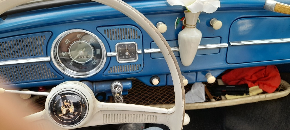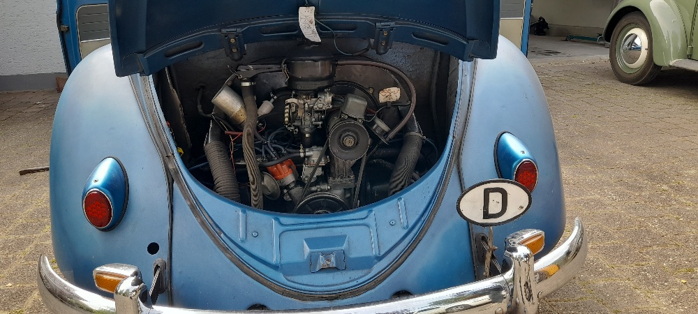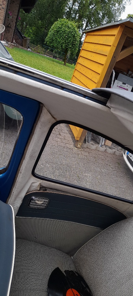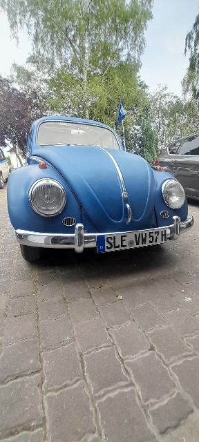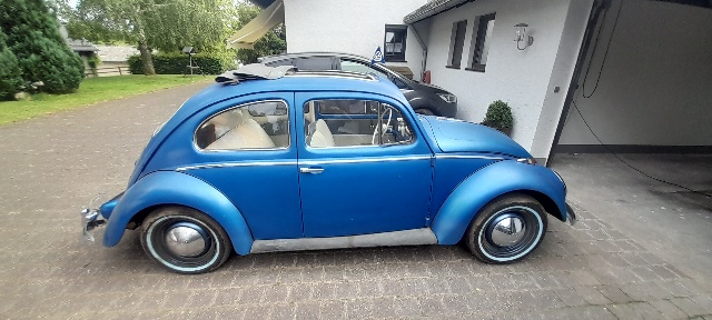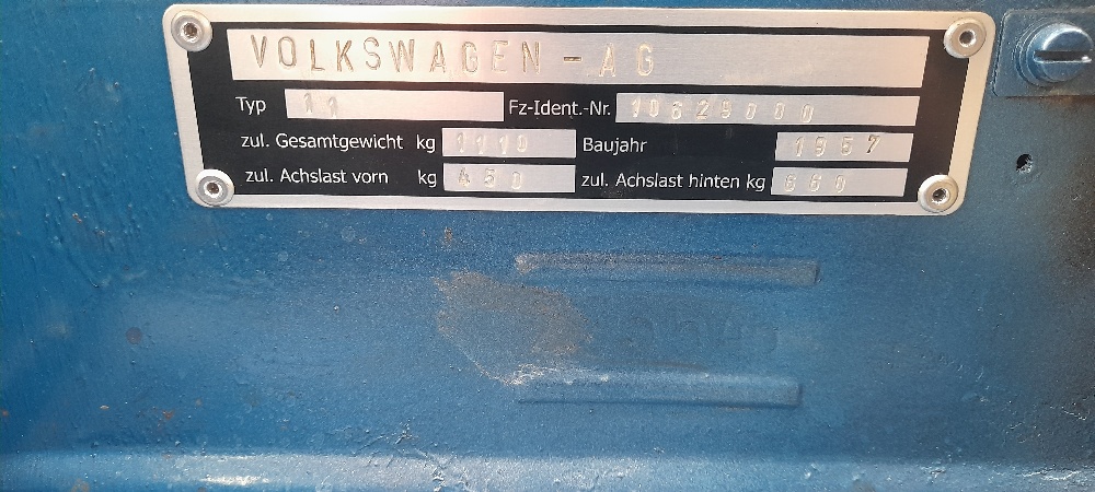 Hallo, ich habe mir den vermeintlichen Rechteck Faltdachkäfer mit EZ. Juli 1957 wie es in der Zulassung steht ,einmal kurz etwas genauer angesehen. Zuerst einmal das wesentliche, laut Vorderachsnummer 1873271 und Aufbaunummer 223546 müsste es ein im Januar 1958 erstmalig zugelassene Fahrzeug sein. Das Faltdach scheint Original zu sein, die Winkerschächte sind irgendwann einmal verschlossen worden und der weiße Kunststoffhimmel ist auch später einmal angebracht worden (er passt nicht so richtig ). Wenn ich jedoch die Fahrgestellnummer 1-0629000 mit der Liste vergleiche ,wäre die Bodenplatte von April 1954. Mann kann das Baujahr der Bodenplatte evtl. etwas eingrenzen. Bis wann wurden die Gummimatten im Fußraum, über die auf der Bodenplatte angeschweißten Befestigungspunkte gehalten? Gab es das im Januar 1958 noch .Es ist auch noch eine Nummer ,vom Belag auf dem Mitteltunnel zu sehen 113863311D. Des weiteren hatte er Original mal die Kotflügel mit den Röhrchen vorne, sieht man noch neben der Reserveradmulde .Leider war keine Zeit für einige Bilder von unten zu machen, er hat dafür aber Trittbretter mit Brezelbezug mit den Verstärkungen unterhalb (sieht aber aus wie Eigenbau).