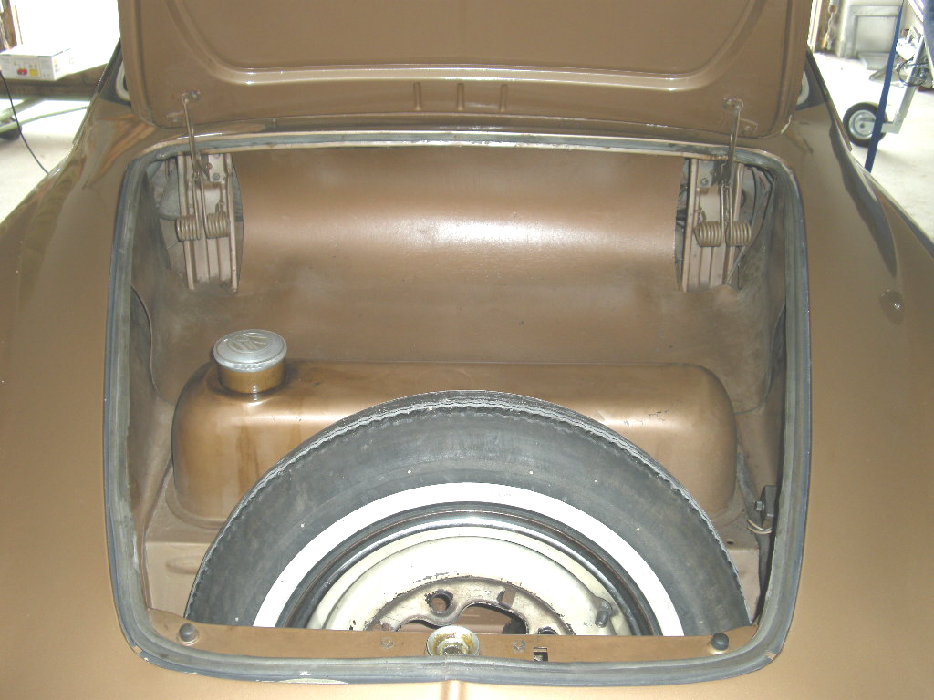 Hier noch ein Beispiel meines damals nicht restaurierten Karmann Ghia von 56 (OK, kein Oval Cabrio, aber auch von Karmann), der Tank ist in der Wagenfarbe und sogar die Kofferraumpappe!