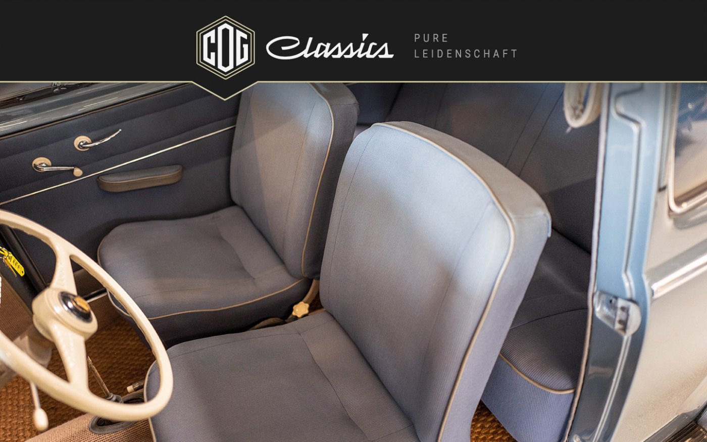 Das Beispiel zeigt Sitze mit einem weißen Keder, die sind so nicht passend, original waren die Keder ebenfalls in Blaugrau.