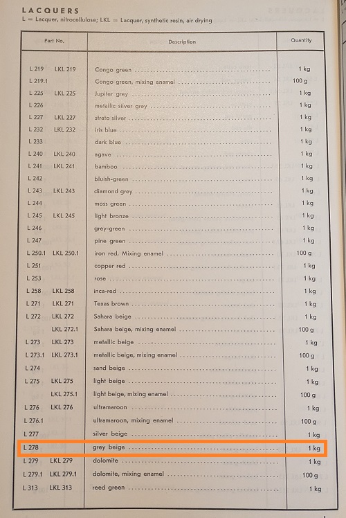 Doch, in Ersatzteileliste 10/1957:die nächste änderung ist erst mit der ersatzteilliste von august 1954 hier im archiv fassbar.In der zwischenzeit gab es eine ausweitung der farbpalette auf nunmehr 4 farbtöne – neu war 'graubeige', für das sich nirgendwo eine farbnummer findet. herr von pidoll nennt in seinem buch 'ein auto schreibt geschichte‘ für 'graubeige‘ die farbnummer l278, die aber sonst nirgendwo genannt wird und von der selbst Glasurit nichts weiss, wo man viele der alten farbtöne verzeichnet findet. Jens meint, dass ral 1019 'graubeige‘ der farbe seines lenkrads nahekommt.