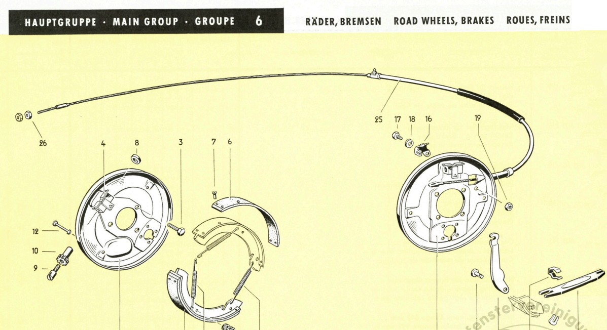 Abgebildet ist die linke Seite, man sieht, dass das Handbremsseil von hinten in die Ankerplatte eingeführt wird, dass die Backe mit dem Handbremshebel in Fahrtrichtung vorne ist und dass der Bremszylinder unten ist. Auch bei der vorderen Ankerplatte sieht man, dass der Bremszylinder unten ist (ist beim Entlüften nicht optimal, aber war so original und funktioniert).