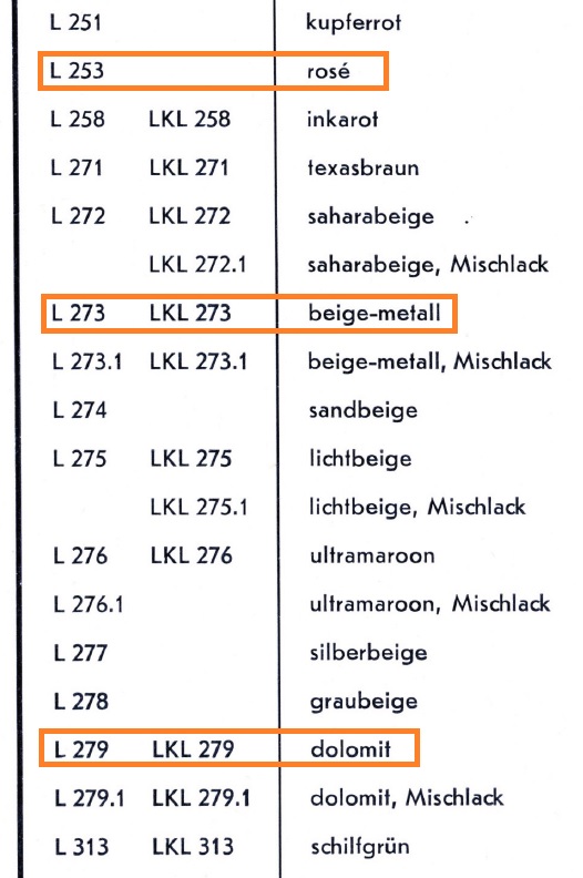 Für die Lackierung der Radscheiben meines dolomit-farbigen 1954er Käfer Cabrios ist die Farbe "L273" ausgewiesen. Leider habe ich kein Muster dieses Farbtons. Der Farbton ist auch nicht in der Glasurit-Datenbank enthalten. Kann mir jemand weiterhelfen, evtl. auch mit einem ähnlichen RAL-Farbton?