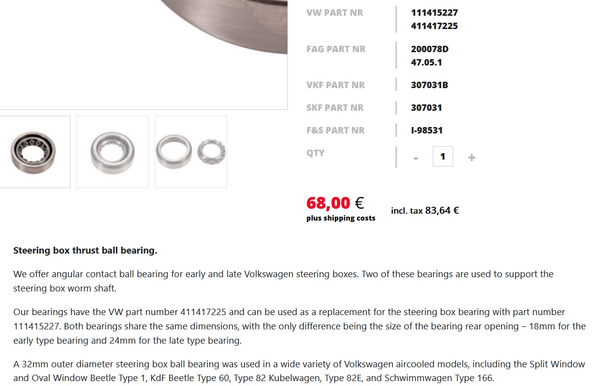 Im VW ETL 1971 (alle Jahre ab 1947 bis 1971) wird für "Spindellenkung" (die originale Ausführung) das Lager 111 415 227 genannt, und nur für "Rollenlenkung" (die spätere Ausführung) die Teilenummer 411 417 225. Das letzte Nummer sollte bei Lieferant FAG die Nummer 508620B haben. Noch immer nicht einfach zu bekommen, aber immerhin weniger teuer.
