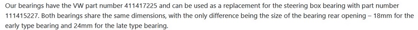 Unsere Lager haben die VW-Teilenummer 411417225 und können als Ersatz für das Lenkungsgehäuse-Lager mit der Teilenummer 111415227 verwendet werden. Beide Lager haben die gleichen Abmessungen, der einzige Unterschied ist die Größe der hinteren Lageröffnung - 18mm für das frühe Lager und 24mm für das späte Lager.