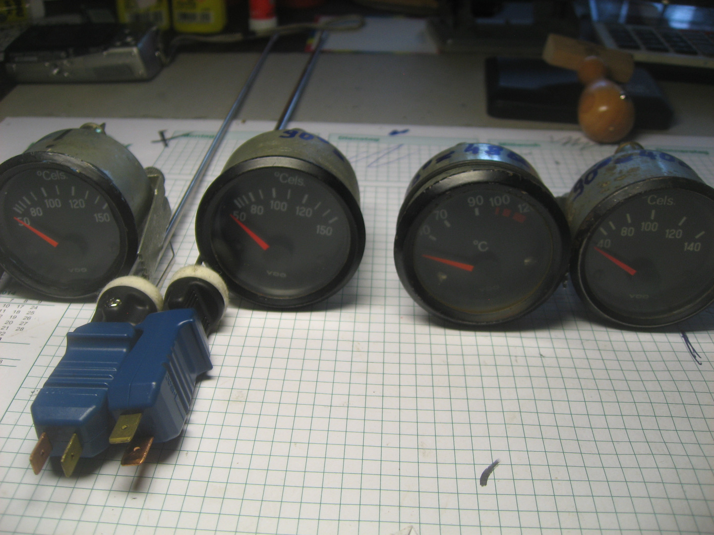 Habe jetzt mal die einzelner Meßinstrumente klassifiziert. Die beiden linken Geräte gehen mit einem Olmeßstabgeber, bei 90 Grad ca 80 Ohm. Die beiden rechten Geräte brauchen einen Geber, der bei 90 Grad ca. 40 Ohm hat.