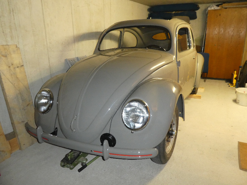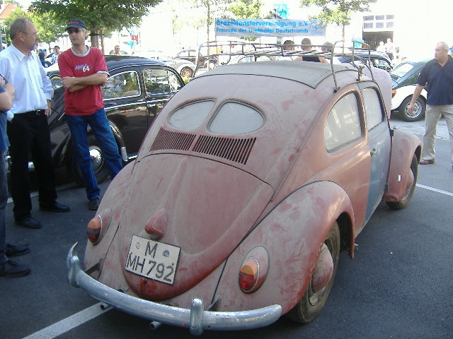 Zum Fahrzeug: Es handelt sich um einen Brezelkäfer, Standard mit Faltdach, ausgeliefert an meinen Vater am 25.06.1952 von der MAHAG München. Das Auto wurde 9 Jahre als Familienauto gefahren und sollte dann durch einen 1500er Stufenheck ersetzt werden, blieb aber dann doch in der Familie als Zweitwagen für die Ehefrau und später die Kinder. Hab darauf dann später das Fahren gelernt. Nach dem Tod meines Vaters wurde er 1976 abgemeldet damit ich ihn so ca. ein Jahr später restaurieren könnte. aus dem einen Jahr wurden dann 42 wie halt so oft bei Restaurierungen. Seit fast drei Jahren bin ich aber jetzt dran. Blech, Lack, Elektrik und Fahrgestell sind soweit fertig. Jetzt fehlt noch der Motor und die Sattlerarbeiten. Hier noch zwei Bilder: 2008 beim Mahagtreffen der BFV aktueller Zustand