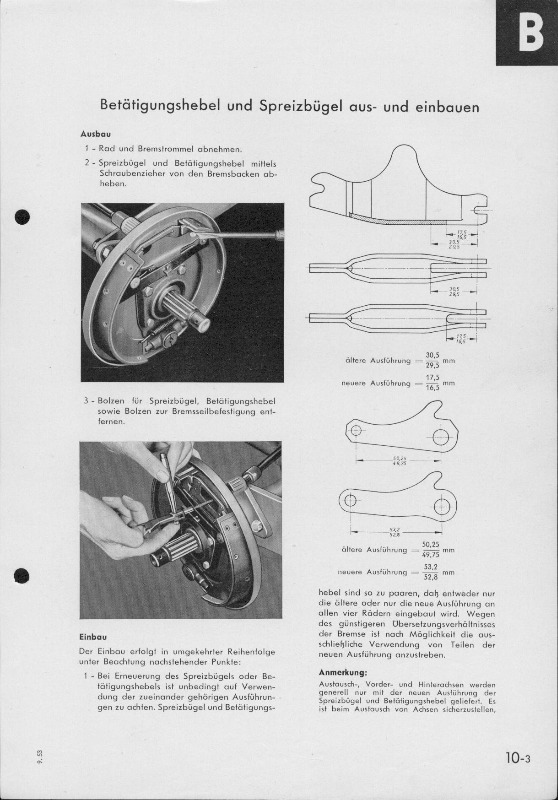 Außerdem ist das von Dir abgebildete VW Dokument leider in einigen Punkten fehlerhaft und wurde nie korregiert Es wird so dargestellt,daß der Betätigungshebel außer in der Länge unverändert ist. Das stimmt so nicht! Der Betätigungshebel der neueren Ausführung hat ein 9er Loch,der alte ein 8er Loch. Das ist in der Rep. Anleitung nicht beschrieben und vermerkt. Dadurch ist ein Vertauschen dieser Teile ohne daß man es bemerkt möglich. Ich kannte einen Käfer,bei dem waren über jahrzehnte die vordere rechte Bremse immer zu schwach. Was war es??