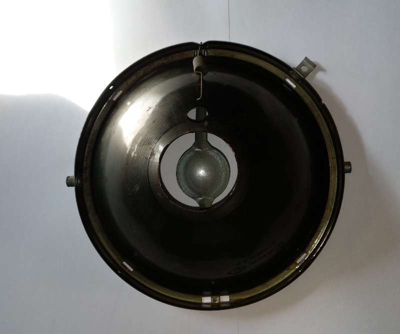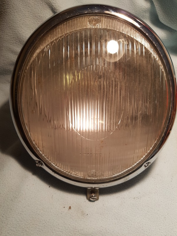 Hans hat recht, das ist ein früher Hella Reflektor (zu erkennen an den beiden Aluminium Lager-Achsen die hier gegenüber auf 3 + 9Uhr sind). Die seitliche Verstellung erfolgt hier noch seitlich mit einem Hebel.
