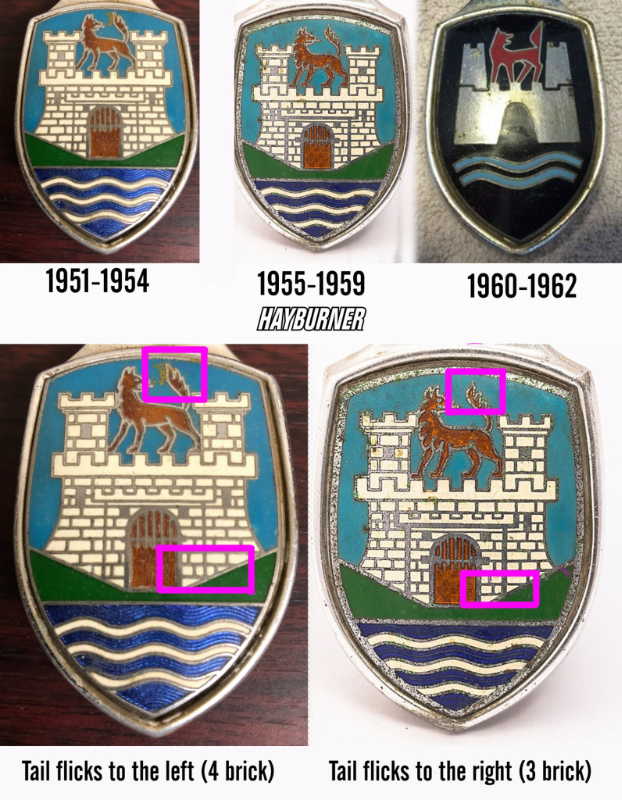 Ich denke aber, dass da einer vom Hayburner Magazine sich zu weit aus dem Fenster gelehnt hat, denn die Embleme sind nicht aufgrund einer Baujahrsänderung unterschiedlich, sondern, weil es einfach 3-5 Zulieferer für diese Wappen gegeben hat die über die Jahre der Produktion (immerhin 9 Jahre beim bunten Wappen) auch noch Abweichungen in der Farbe hatten und sicherlich ihre Werkzeuge (Formen zum Prägen der Konturen usw.) aufgrund von Verschleiß auch noch regelmäßig erneuern mussten, so dass auf diese Weise auch noch kleine Unterschiede zu verzeichnen sind. Ich habe z.B. in meiner Sammlung bunte Wappen wo die Farbe des blauen Wassers fast transparent ausfällt.