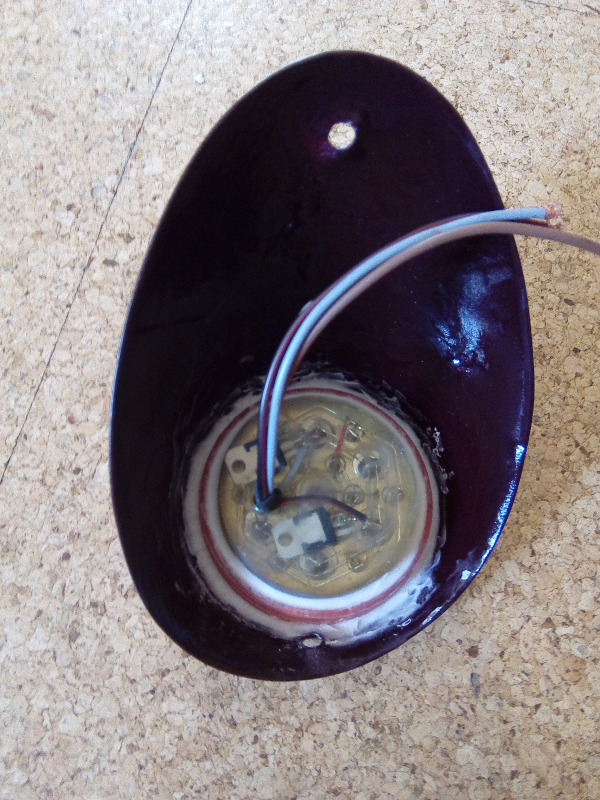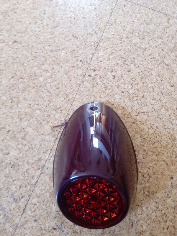 das ist neumodisches Hexenwerk,LED Gelumpe das mir hilft viele unfallfreie Kilometer abzuspulen. Drei Anschlüsse,eines fürs Rücklicht ,eines zum amerikanischen Blink/ Bremsen und noch Masse. Das hat mir ein toller Clubkamerad angefertigt..Das Glas ist original.der Rest ist schweigen. Ikea hat mit einem Trinkbecherrand mit Anteil an dem Konstrukt.