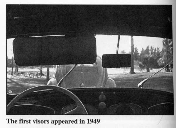 To June 1949, no sun visors were supplied on the Beetle. The deluxe and convertible, when introduced in June 1949, came equipped with a driver's side visor. With the introduction of the visor came a new means of attaching the mirror. The new mounting bracket held a horizontal rod to which, on one end, the visor was attached. On the other end of the rod, after it curved downward 90 degrees, the rear view mirror was attached. A second visor for the passenger was available as an option.