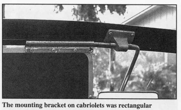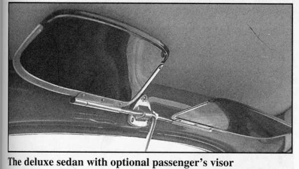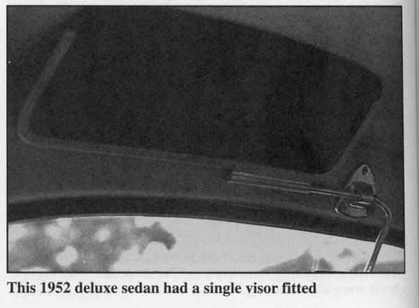 to fit the bracket on the convertibles, the triangleshaped sedan bracket was modified and made rectangular. In essence, the top of the sedan bracket was cut off to make the cabriolet visor bracket. This bracket was held in place with two screws, while the sedan version was secured with three. As on the deluxe, the cabriolet mirror exterior and support arm had a bright metal finish.