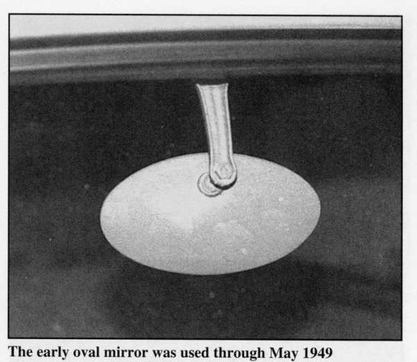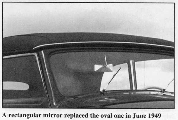 In June 1949, the inside mirror was changed from oval to rectangular. The deluxe had a bright-metal backed mirror while the standard rear view mirror had a painted back finish.