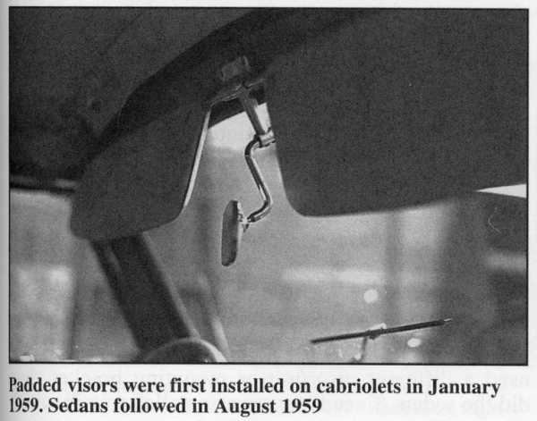 In August of 1959 the sedan sun visor was changed from hard plastic to a padded vinyl material. In addi-tion, for the first time, a passenger's sun visor was standard equipment on the sedan.