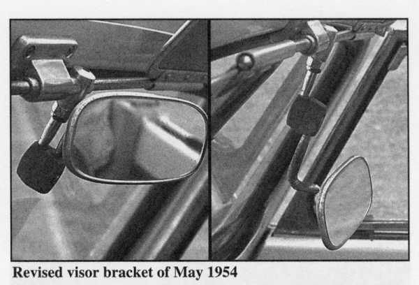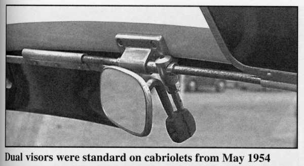 Two sun visors were introduced as standard equip-ment in May 1954. The new mirror attaching arm was secured to the right (passenger's) side sun visor rod. This convertible mirror bracket was totally different than the sedan version therefore the two were not interchangeable.