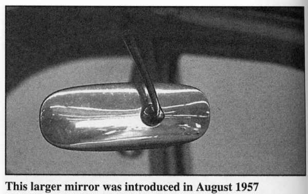 In August 1957 the inside mirror changed again. The mirror was made slightly larger and more oval in shape. Since more could be seen out of the new, larger rear window, a larger rear view mirror was needed.