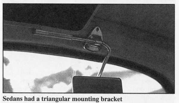 During the 1950's different Beetle models and years used various means to attach the rear view mir-ror. Notice also that the shape of the mirror changed during this period. First, a look at the sedan inside mirror.