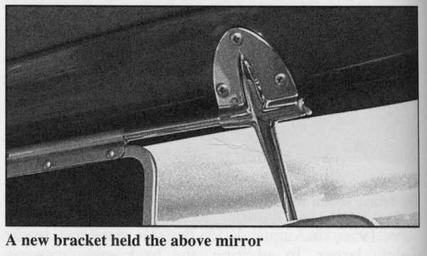 The bracket mentioned above held a chrome plated rod. On the left end the visor was attached. On the right end, after it curved downward 90 degrees, the rectangular mirror was attached.