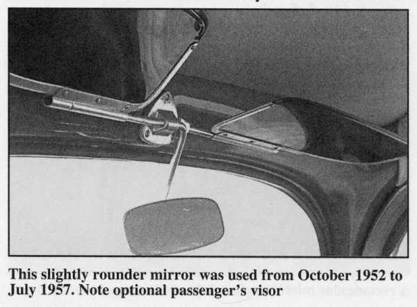 From October 1952 to July 1957, the shape of the mirror on all Beetle models became more rounded at the top and bottom. This was a noticeable change from the previously rectangular mirror. The standard mirror was still mounted directly below the bracket