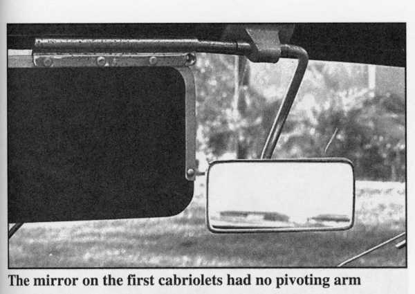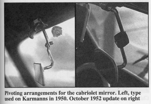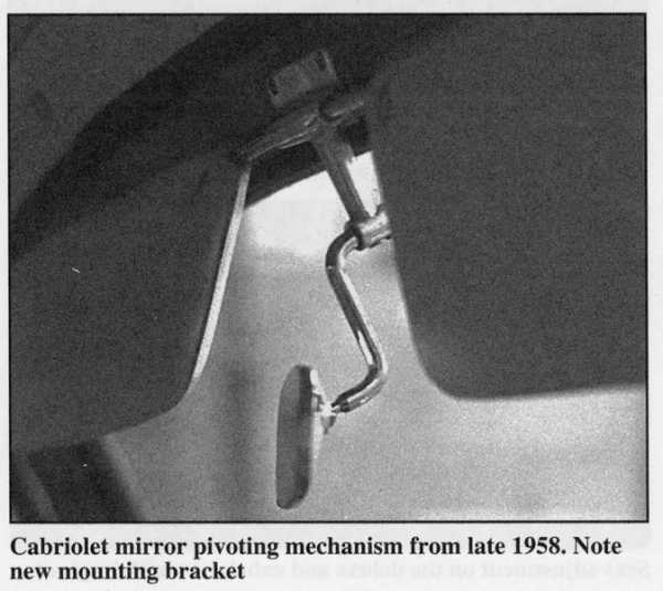 In late 1958 the cabriolet mirror mounting bracket changed. This changed occurred at the same time as an the sedan. The new bracket had the mirror support arm dropping down from its center. The cabriolet continued with the pivoting arm, but used a modified style that was not interchangeable with the one used before. See picture for comparison of the two styles.