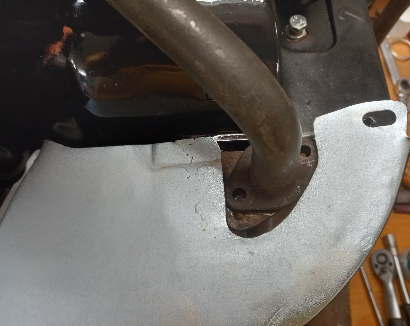 Leider muß ich mich bei der Vorwärmung noch einmal entscheiden. Ich hatte das Abschlußblech für den alten Auspuff angepasst. Der passt aber nicht an die Vorwärmung des 1500ers Hirschgeweihes. Zwischenzeitlich hatte ich die linke Vorwärmung am Auspuff dem Hirschgeweih angepasst., aber nicht dabei ans Blech gedacht. Also Auspuff links wieder auf alt trimmen und das Hirschgeweih passend machen. Oder den Auspuff rechts noch an das Hirschgeweih anpassen und ein neues Abschlußblech zurechtschnitzen.
