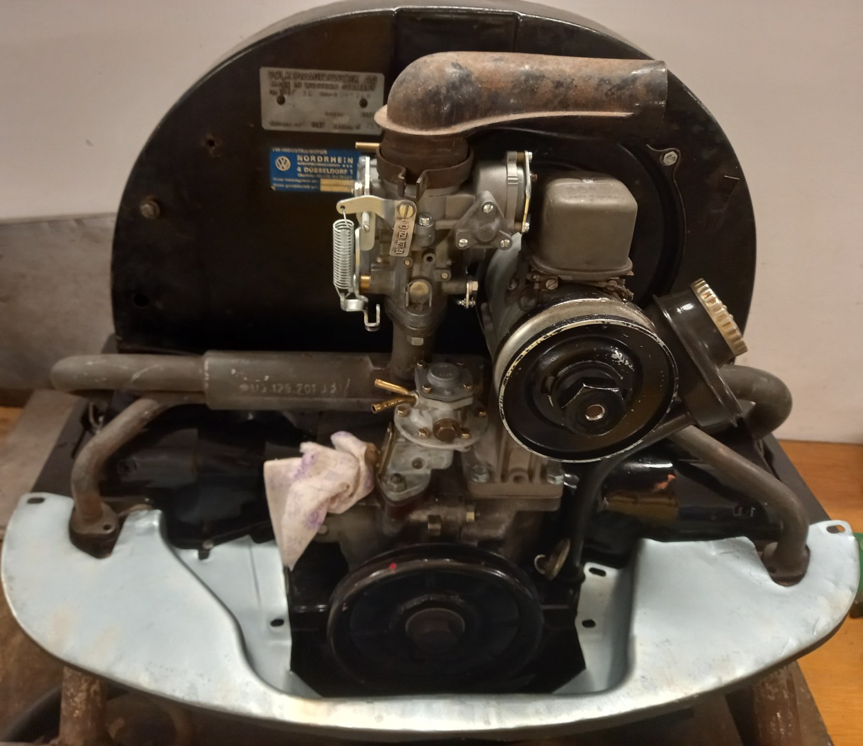 Ich habe noch einen sehr guten H-Motorblock den ich ein wenig auf alt getrimmt dafür verwenden werde. Von 60 bis 62 wurde der erste 34 PS Motor noch mit einer dafür modifizierten Klappenheizung ausgerüstet. Die wollte ich schon immer mal an einen "big Block" montieren ,natürlich kombiniert mir einem runden Gebläsekasten. Die Kühlluftregelung sollte über den Drosselring funktionieren. Das klappte besser als erwartet. Nur bei dem Thermostathalter habe ich die neuere Variante genommen. Außer einer Öffnung für den Hebel im Zylinderabdeckblech brauchten keine Änderungen vorgenommen werden. Lima ist eine 90mm 12Volt 20A. Am Limahalter schneide ich immer die hinteren 8mm Bohrungen zu Langlöchern auf. Die vorderen Bolzen tausche ich gegen Schrauben. Der Halter läßt sich so unter der Lima wegziehen.