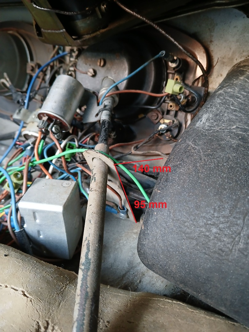 Der Halter für das Führungsrohr der Tachowelle hat eine Höhe von 95 mm von Blechboden bis Mitte Rohr. Der Abstand in Höhe Mitte Führungsrohr bis zum Armaturenbrett (Blech, nicht Rückseite Tachoplatte!) sind 140 mm.