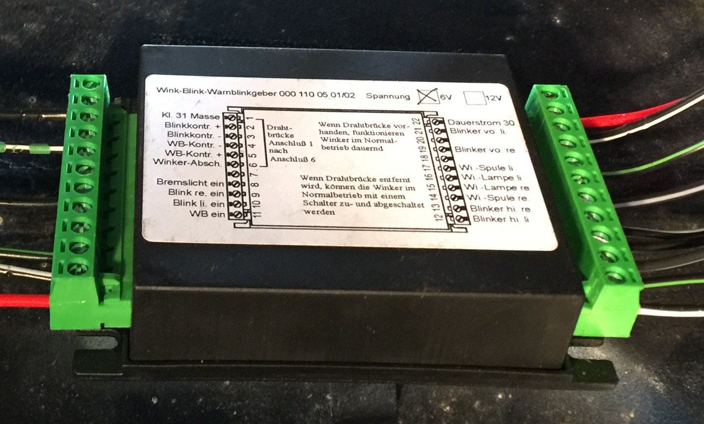 das Relais von Kabel Schmidt ist auch meine Nummer 1 , auch wenn es laufend teurer wurde. Der Warnblinker ist neben dem Blink-Bremsen integriert, der Winker kann ein und aus geschaltet werden und für mich wichtig ist die Anhängerschaltung. Achtung: Beim Arbeiten an den Blinkern etc. immer die Batterie abklemmen selbst wenn man nur ein Birnchen wechseln will. Das Relais ist nicht gegen Kurzschluss gesichert. Ich lasse den Winker nur leuchten wie im Original und nicht blinken. Montiert habe ich es unter dem Radio. Ich habe hier aber auch eine schwarze Kunststoffbox die aussieht wie ein großer Sicherungskasten.