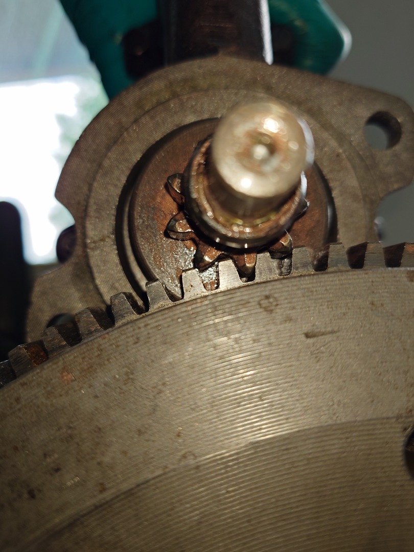 Mir fällt noch auf, dass die Zähne auf dem Zahnkranz des Schwungrades irgendwie nicht so aussehen, wie ich sie normalerweise kenne. Als ob sie sehr abgeschliffen, oder abgenutzt sind.