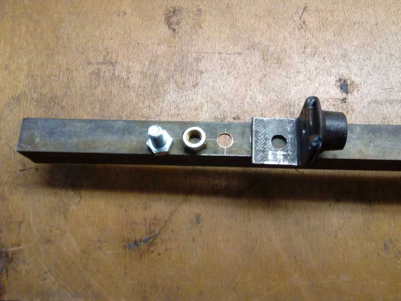 heute habe ich meine Schaltstange fertig überholt. Das Rohr war mir zu rostig.Zuerst habe ich mir eine Lehre gebaut .Ein ausreichend langes Winkeleisen wurde an einem Ende mit einer 16er Bohrung versehen. Von einer 16er Schraube habe ich das Gewinde abgeschnitten und durch das Loch gesteckt als Aufnahme für die Schaltstange. Für das Ende der Schaltstangenkupplung habe ich eine Schaltstangenkupplungshälfte mit einen Winkel verschweißt und auf dem langen Winkeleisen verbohrt.
