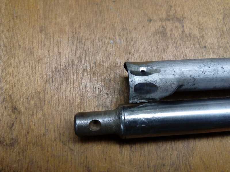 An der Schaltstangenaufnahme habe ich die Schweißnaht vor Kopf abgeflext . Da damit der Fitting nicht zu lösen war habe ich noch mit einem 21mm Bohrer in das Ende gebohrt nachdem ich vorab mit einem Fräser die Schweißraupe egalisiert habe.Am Schaltstangenkupplungsende die sechs Punktschweißungen dünn geflext. Mit einem Rohrabschneider konnte das gezogene Rohr 22x1 prima auf Länge gebracht werden. Wenn es ein geschweißtes ist muß man die Naht innen wegfräsen.