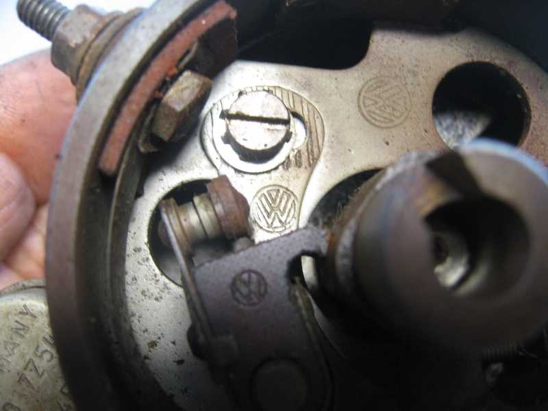 Interessant ist auch das VW Zeichen auf der Grundplatte der Fliehkraftverstellung und die untypische Befestigung der Klammer für die Verteilerkappe.