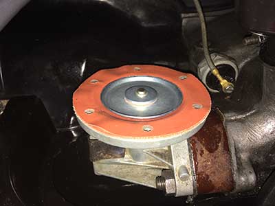 Sodann nur den unteren Teil der Pumpe samt installierter Membrane einbauen und mit Dichtungen und Zwischenstück an das Kurbelgehäuse festschrauben. Jetzt die Kurbelwelle soweit langsam drehen, dass die Membrane leicht nach unten gezogen wird, bis diese mit der oberen Kante des Pumpenunterteils auf einer Ebene ist. Erst jetzt den oberen Teil der Pumpe aufsetzen und Festschrauben.