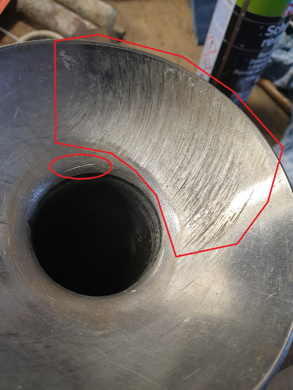 Zum einen gibt es die Riefen (Im Achsrohr tiefer als am Getriebegehäuse). Zum Anderen ist der "Teller" nicht ganz rund (0,5 mm) und er scheint einen kleinen Riss zu haben.
