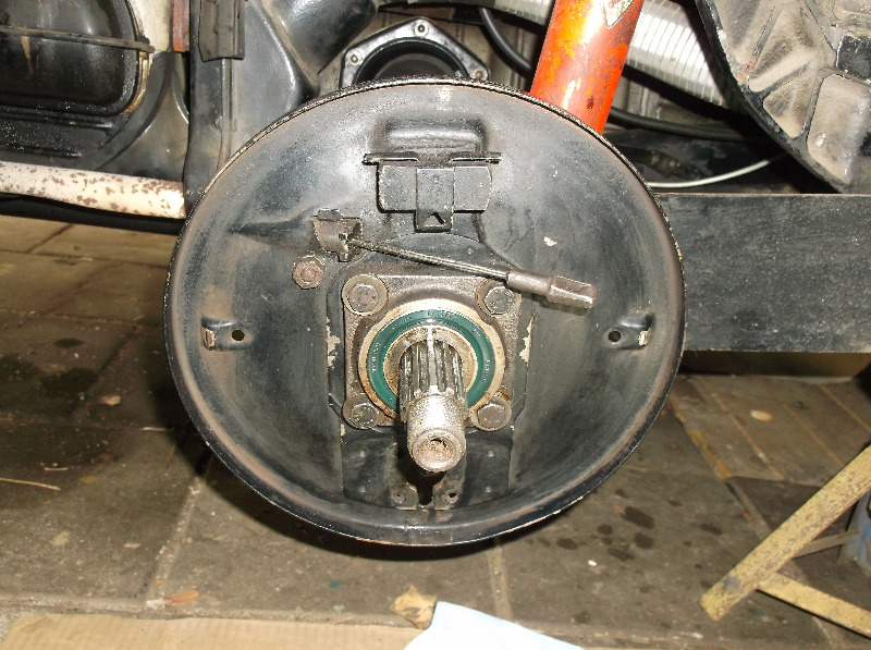 Hier ein Bild von der Bremse hinten links bis 12/53. Bis dahin eine lange Feder oben. Später dann 2 kurze Federn oben