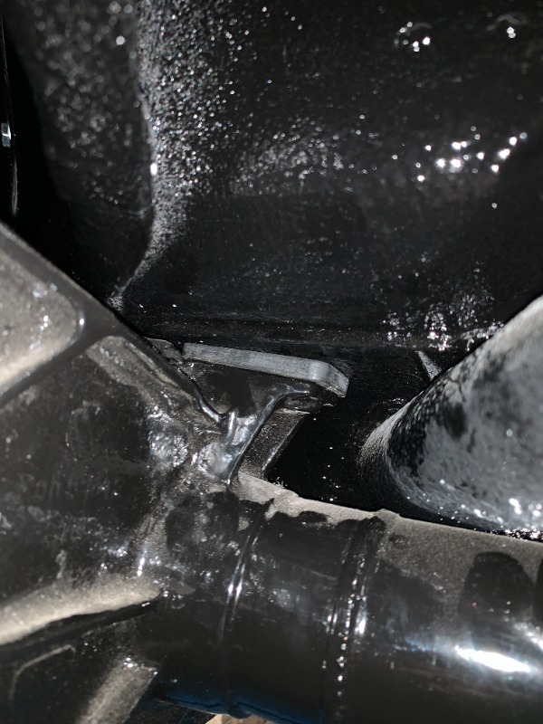 Ich habe jetzt die Gummis eingebaut und die Befestigung der hinteren Karosserieaufnahme berichtigt. Links auf dem Bild die richtigen Schrauben. Rechts die, die von der Kaeferfabric reingewürgt waren.