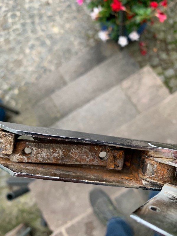 Etwas beruhigen kann ich dich bei den Rahmen, wenn du das Gelenk vorsichtig erwärmst, wird man das später wohl nicht erkennen, denn erst ca. 5-8cm oberhalb des Niets kann man den Chromrahmen außerhalb des Fensterschachtes sehen. Und das "Flacheisen mit den 2 Gewinden" kannst Du leicht nachbauen, man braucht nur die Blechlaschen aufbiegen, dann kann man das Gewindestück entnehmen. Und das angenietete U-Eisen ist dick genug, es wird nicht durchrosten, hier reicht eine Entrostung der Oberfläche und anschließendem Lackieren. Man kann natürlich auch den Niet ausbohren, auf einer Drehbank nachfertigen (im Übermaß, wenn die verrostete Bohrung aufgerieben werden muss), den Rost entfernen und hinterher alles wieder vernieten.