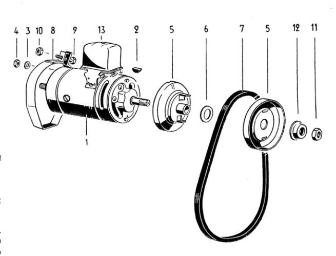 Ab Mitte 1955 bekam die Lichtmaschine eine verbesserte Riemenscheibe, mit zwei Mitnehmerlaschen (#5 im Bild). Die große (SW 36mm) Mutter wurde ersetzt durch ein kleineres Exemplar (SW 21) mit Topfscheibe (#12 im Bild). Und damit hatte ich neulich einige Probleme.