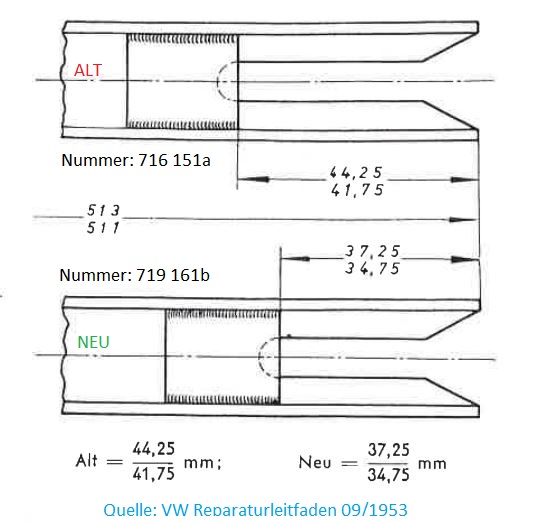 Hallo zusammen, danke für Eure Antworten, Das Schienenrätsel konnte mit Hilfe eines kundigen Freundes und seiner umfassenden VW-Unterlagen gelöst werden. Im VW-Reparaturleitfaden von 9.53 ist die Änderung der Schiene beschrieben. Die Tiefe des Betätigungsausschnitts hat sich von ca.44mm (wohl vor 10/52 und älter) auf ca.37mm (wohl ab 10/52) geändert. Ebenfalls hat sich die Bremswelle in der Pedalerie geändert (Teilenummer 11 716 111 (alt) auf Teilenummer 11 719 101a (neu). Laut Reparaturleitfaden dürfen die Teile nur paarig (alt/alt oder neu/neu) verwendet werden. Vielleicht ist das einer der Gründe, weshalb es Standardkäfer mit schlechter Bremsleistung gibt. Den genauen Zeitpunkt der Änderung konnten wir nicht ermitteln. Die Firma Werk34, die aktuell einige Schienen im Angebot hat, hat die Teilenummer mittlerweile korrigiert. Die Schienen, die dort im Angebot sind, haben eine Tiefe von 37mm und passen deshalb zu den neueren Fahrzeugen. Das Angehängte Bild ist ein Foto aus dem Reparaturleitfaden. Die Teilenummern haben wir entsprechend der Teilekataloge ergänzt.