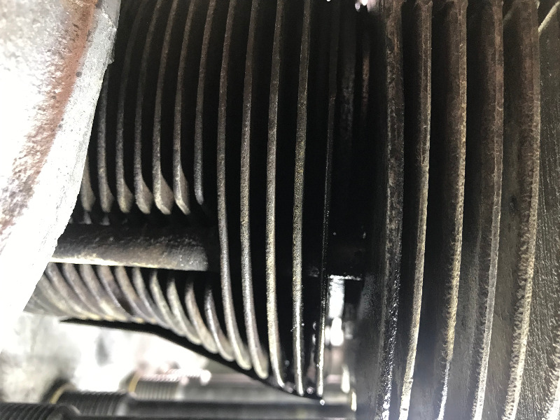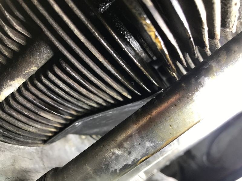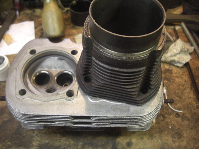 Er war im Bereich der unteren Luftleitbleche stark verölt, die Stößelrohre aber absolut dicht.Bei einer Probefahrt ist mir aufgefallen dass er beim Beschleunigen ungewöhnlich laut war.Hab dann einen Kompressionstest gemacht und eine Druckverlustprüfung. Dabei war besonders an Zyl.1 und 3 ein deutliches Blasgeräusch zu vernehmen das ich aber nicht lokalisieren konnte.Also hab ich den Motor ausgebaut, die komplette Verblechung entfernt und picobello gereinigt. Dann hab ich ihn im Freien eine Weile laufen gelassen bis es anfing zu tropfen, und zwar zwischen Kopf und Zylinder.
