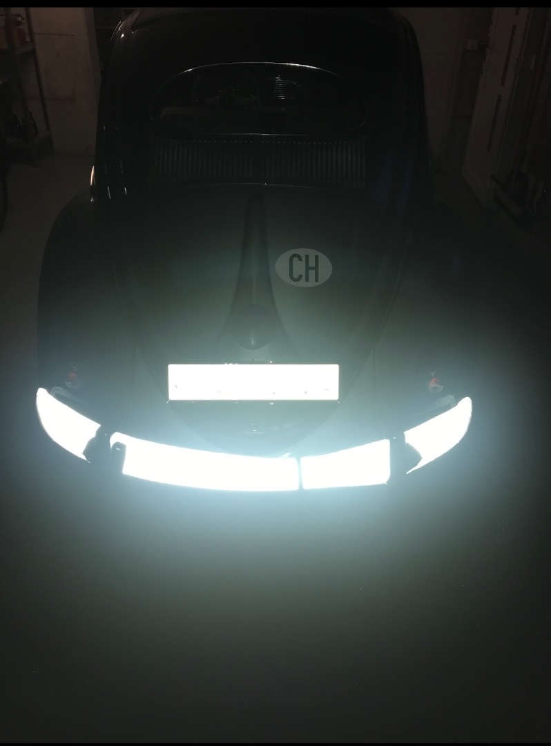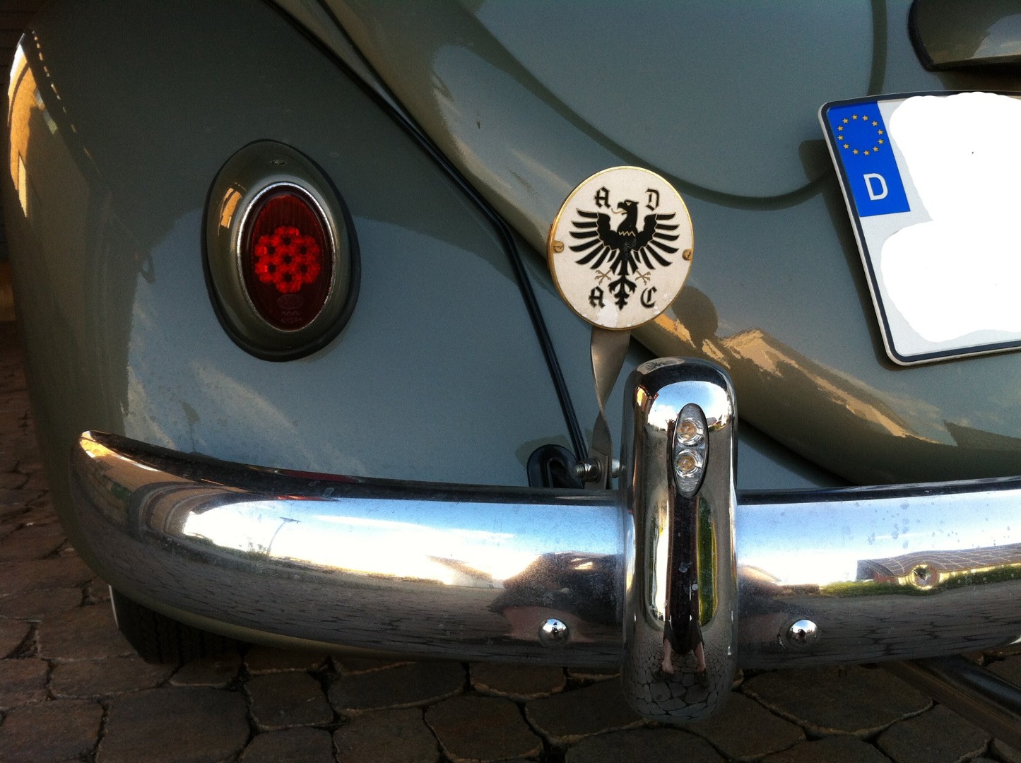 Unser Ovali von 1954 hat noch die Herzleuchten montiert und wird mit 6Volt betrieben, was bedeutet, dass das Standlicht nach hinten und Stop nach oben leuchtet. Die Herzleuchten sollen bleiben! Ich habe nun schon Standlicht und Bremslicht getauscht in Kombination mit einem Brems-/Blinkrelais. Heisst das Bremslicht geht nach hinten zusammen mit dem Stop. Standlicht halt nach oben, auch nicht ideal. Für schlechtes Wetter oder Dunkelheit hat meine Frau aus reflekierenden Stoff einen Überzug genäht, welchen man einfach über die Hörner der Stossstange legt.