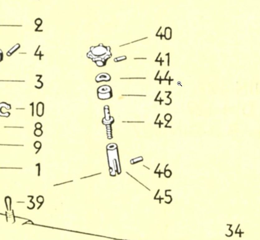 direkt unter dem Drehrad befindet sich ein Kerbstift (41) den man austreiben kann. Ist aber i.d.R. nicht zu empfehlen da dabei in eingebauten Zustand meist ein Stück vom Drehrad ausbricht - der Bakelit ist halt alt. Der sicherere Weg ist den Heizungszug an beiden Heizklappen lösen, die Kappe (43) losschrauben und die komplette Baugruppe (40-46) nach oben rausziehen und dann den Heizungszug aushängen (Zylinderstift 46 rausziehen).