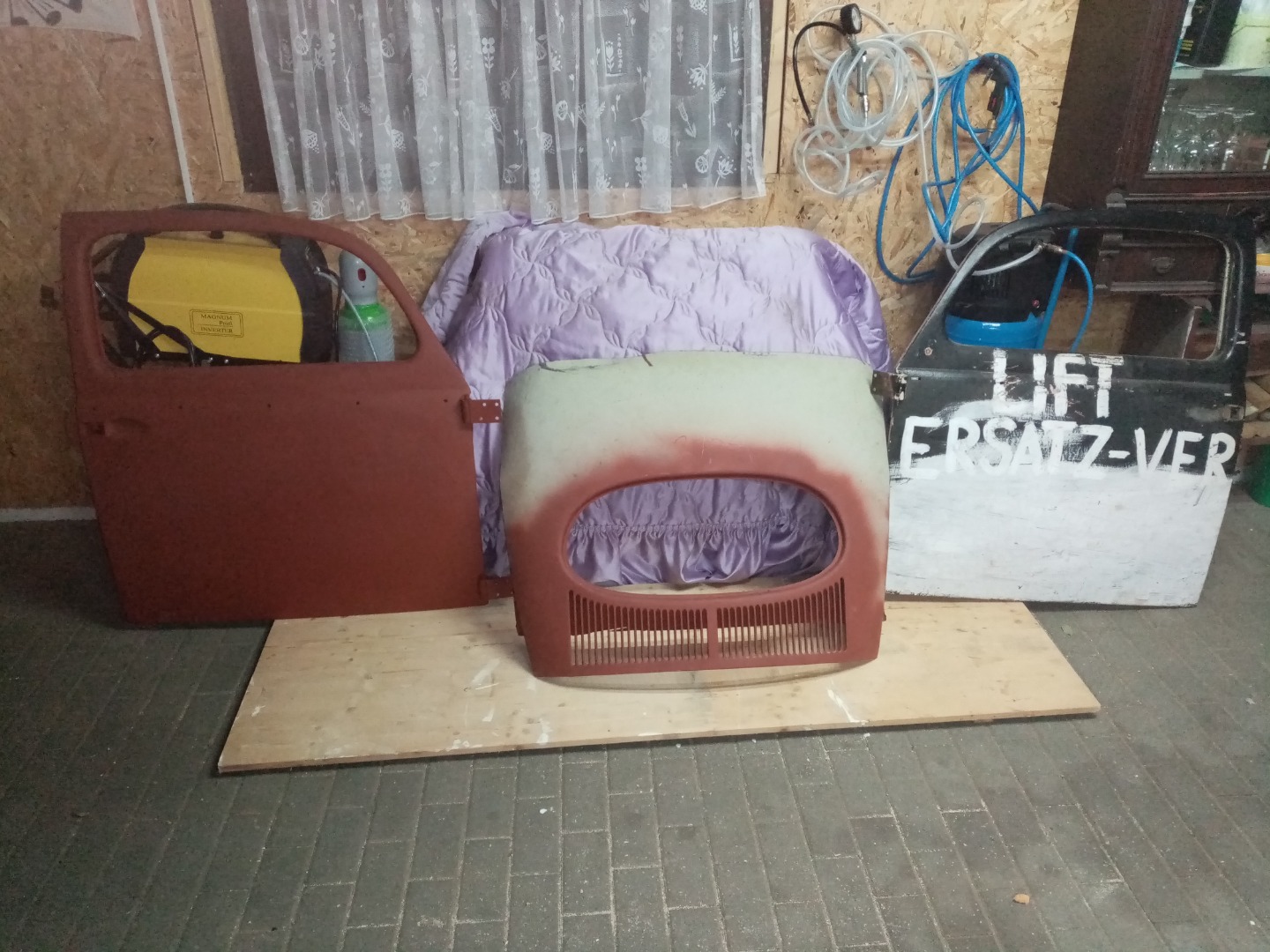Hier der Anfang, Ovalifenster bekommen, eine Tür entlackt und grundiert, die andere noch im Urzustand.
